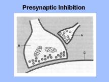 In the diagram below, terminal A forms an inhibitory synapse with terminal B. Explain why the response of C to stimulation by B is less when A is also activated. (4 pts)